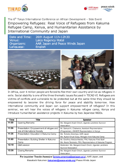 In this event, we will hear the voices of refugees in Kakuma refugee camp, Kenya and introduce humanitarian assistance projects in Kakuma.