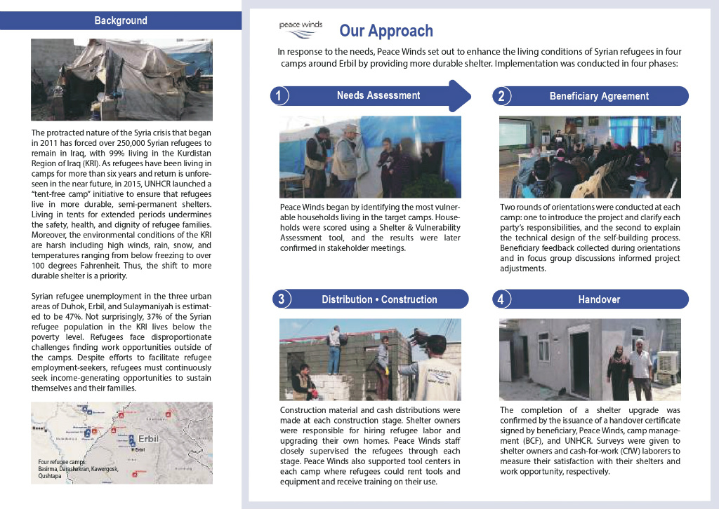 Recognizing Peace Winds’ successful, proven approach and leadership in the shelter sector, PRM recently awarded Peace Winds with another cooperative agreement to continue upgrading Syrian refugee shelters in the KRI. This next project also includes improving the quality of life of persons with disabilities and the elderly by installing accessibility additions to homes and camp facilities.