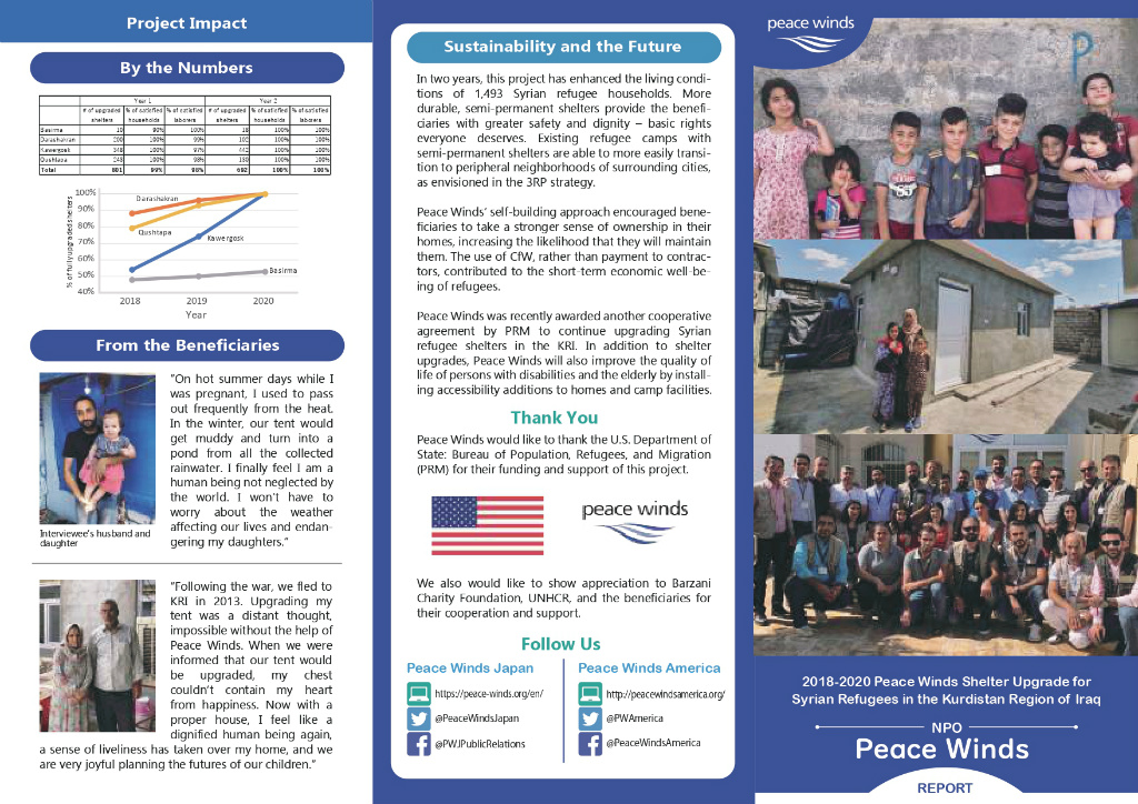 Two years, thousands of person-hours, and 1,493 upgraded shelters later, Peace Winds’ shelter upgrade project came to a close on September 29, 2020. Funded by the U.S. Department of State: Bureau of Population, Refugees, and Migration (PRM), this project enhanced the living conditions of Syrian refugee households living across four refugee camps in Erbil Governorate in the Kurdistan Region of Iraq (KRI).