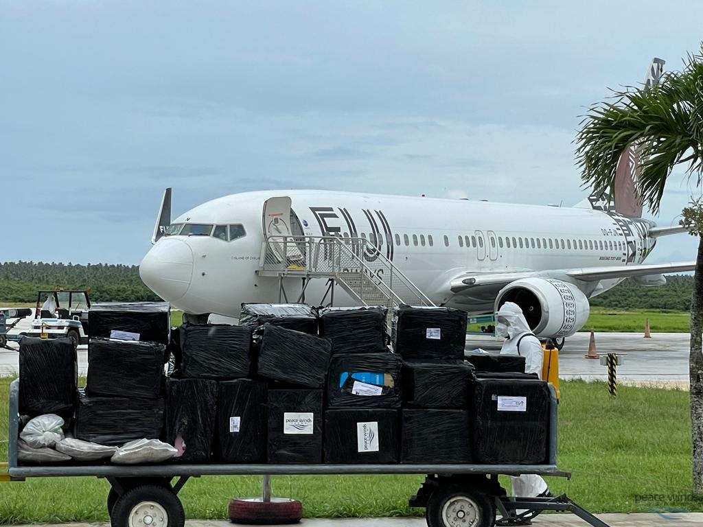 Supplies flown included rice, canned fish, cooking oil, sugar, water purifiers, water purifying tablets, antibacterial soaps, hand sanitizers and items of personal protective equipment. The consignment was unloaded in a contactless way to keep COVID-19 out. Foreign aid workers were not permitted to enter Tonga and all goods arriving in the country were required to be quarantined for at least 72 hours.