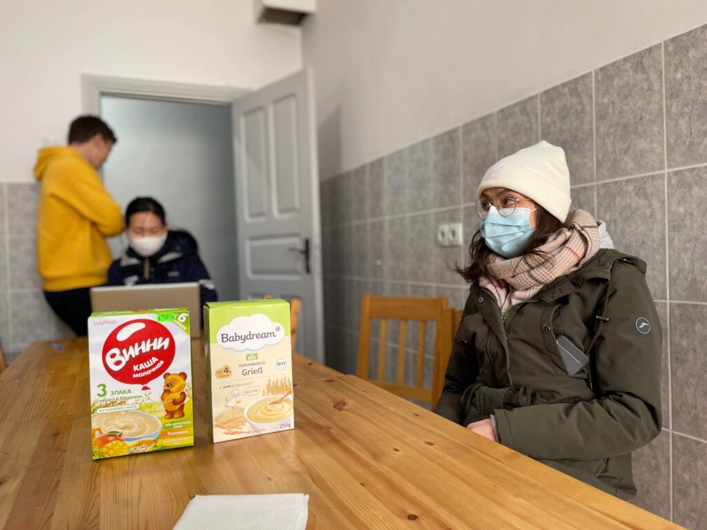 Ukrainian woman, Inga, fled her home town of Mykolayiv with her mother and daughter. She was lining up with other refugees at the shelter when Peace Winds delivered the donations today.