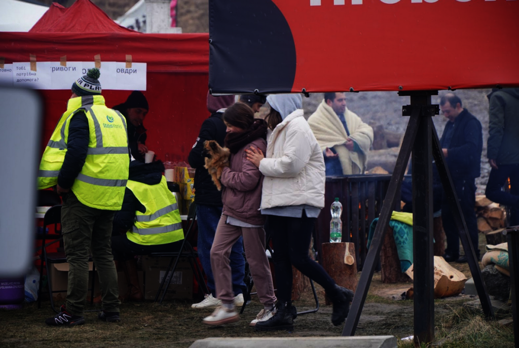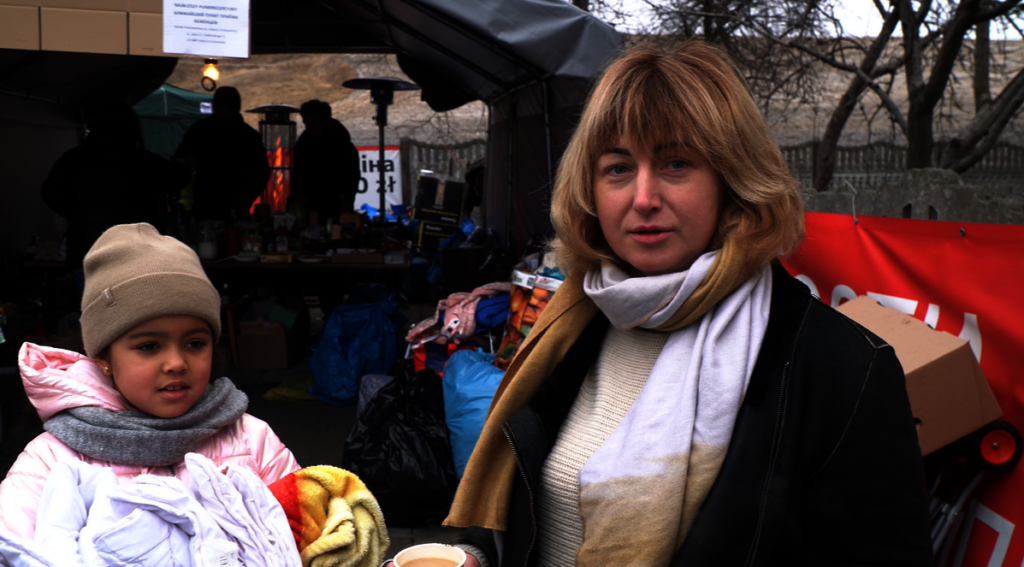 Two of those refugees who had got through the border were Natalia, a single mother, and her daughter Ananda, who had evacuated from Chernihiv in northern Ukraine, They told us that as soon as they saw Russian troops they had got into their car and fled, leaving all their belongings behind picking up supplies at the Caritas booth, where they were offered hot drinks. They said they didn’t know anyone in Poland, but had fled anyway, and it took them two days to get across the border. “I don’t know what we’re going to do now,” said Natalia, who looked weary from the trip.