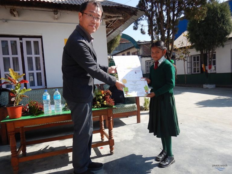 The prizes were distributed to the children by Mr. Yasufumi Tsukamura (Asian Regional Manager, Peace Winds Japan) accompanied by Ms. Nana Yamaguchi (Country Representative, Nepal Office). The ceremony was held on the premises of Lotus International School, Bhaktapur, where the representatives of Peace Winds Japan were welcomed by the children and the teachers of the school with flowers.