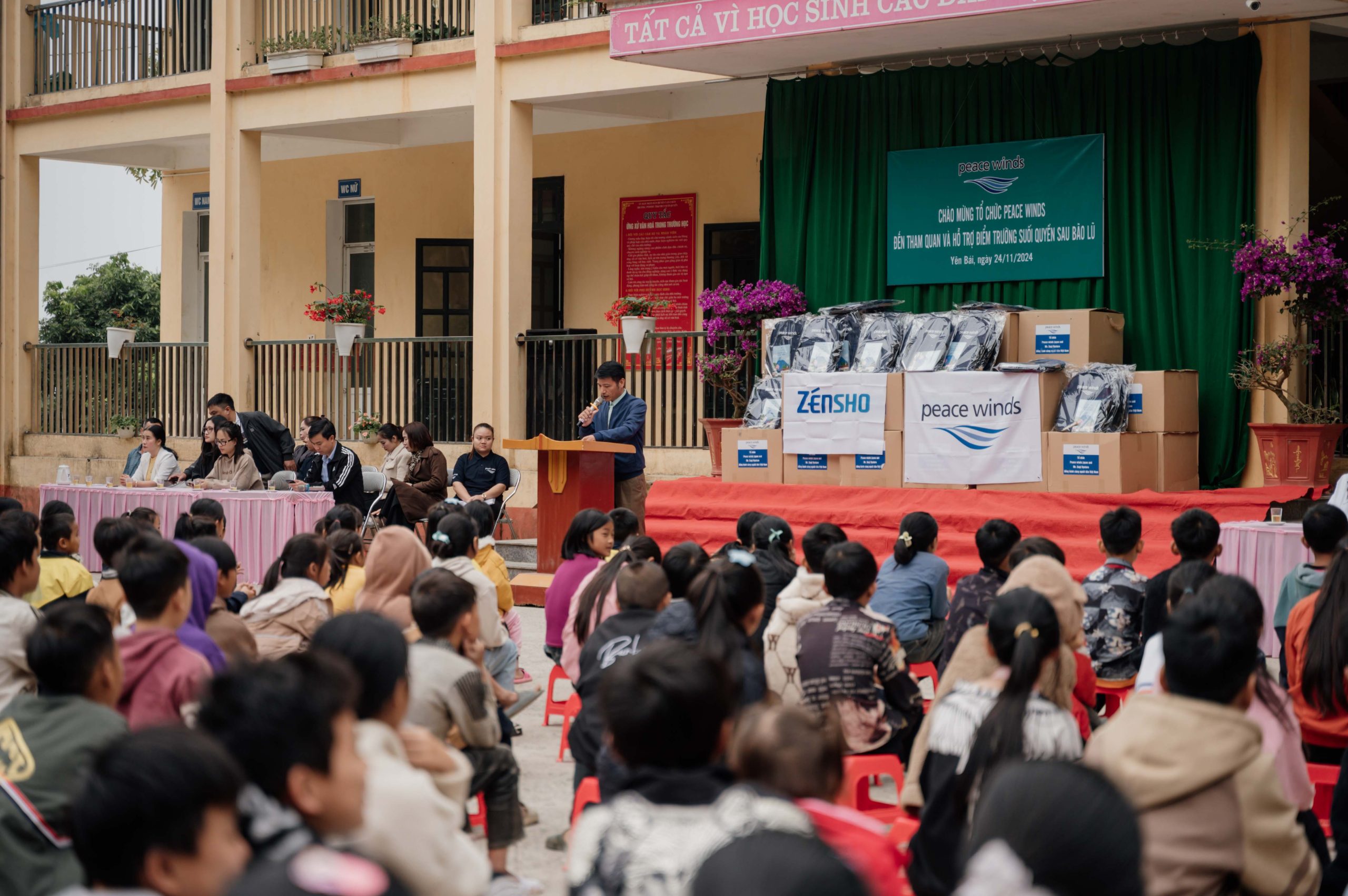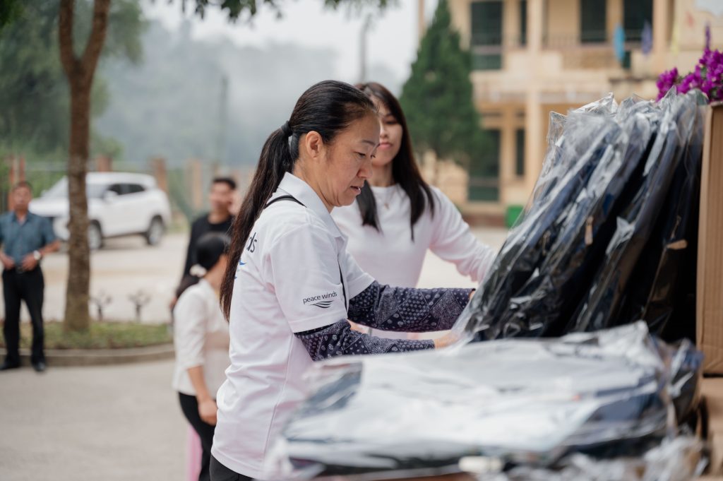 In November, Ms.Yamamoto, the Director of the Overseas Operations Department, visited three schools in Van Chan District, Yen Bai Province, and delivered a total of 1,132 sets of school supplies to the children. This initiative followed the severe flooding caused by Typhoon No. 11, which hit northern Vietnam in September. The typhoon, along with heavy rains, resulted in significant flooding across about half of the province. Despite the water still being stagnant in some areas after the typhoon, the distribution of school supplies aimed to support the children as they started their new school term.