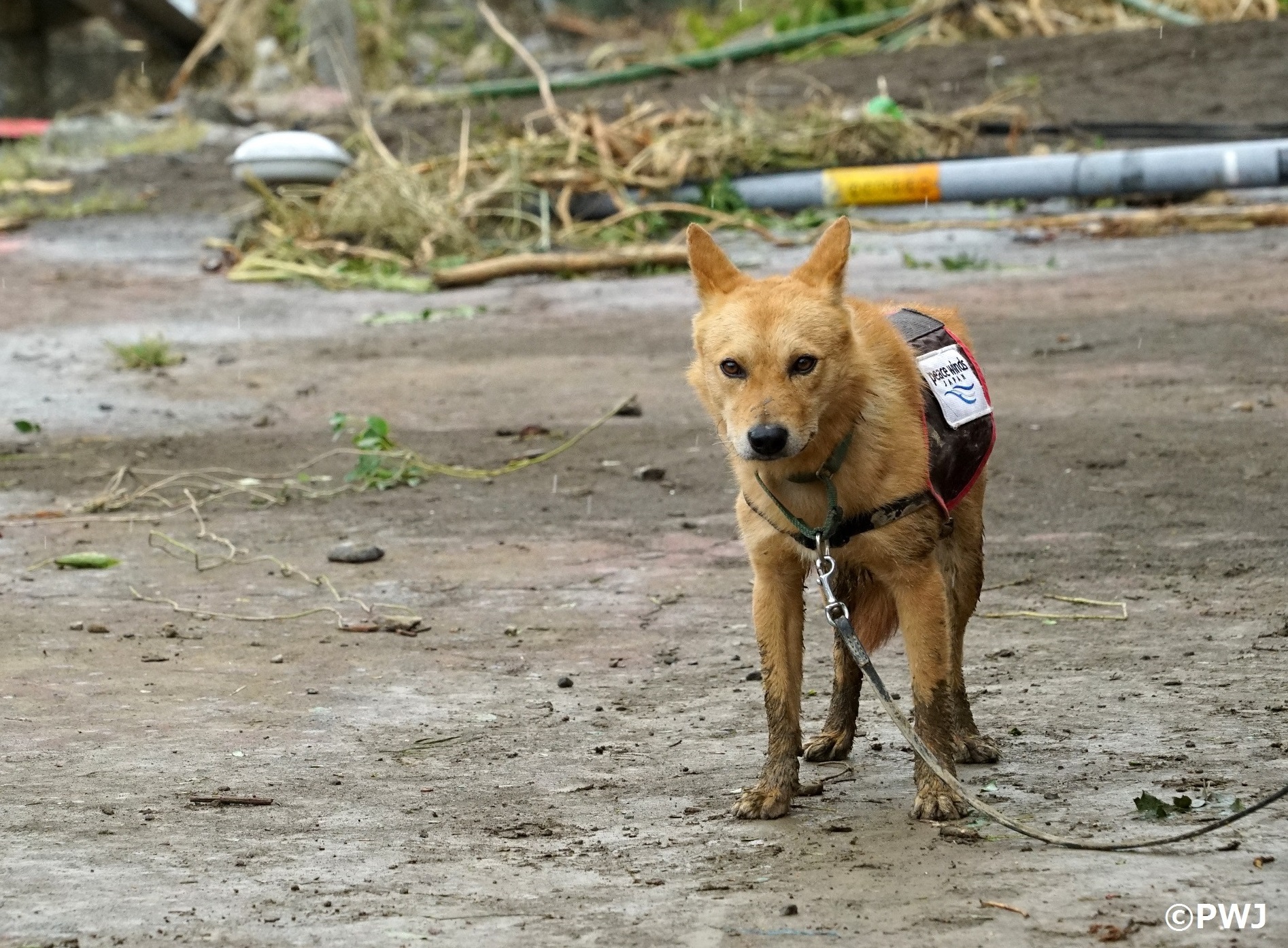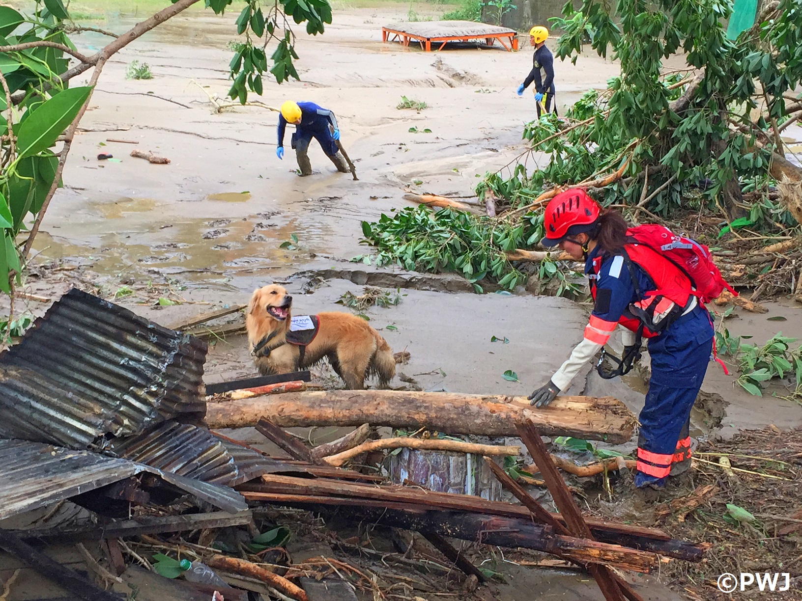 Augusut 8, 2015, PWJ’s Search and Rescue (SAR) team and its SAR dogs Yumenosuke and Hulk, have conducted an extensive search operation in the northwest of Taiwan. Typhoon Soudelor landed in Taiwan in the morning August 8 and its strong winds and rain caused the loss of 6 people and left millions without electricity. The team responded to a request to search for a missing person in northern Taiwan in New Taipei City, and extensive search and rescue operations were conducted.