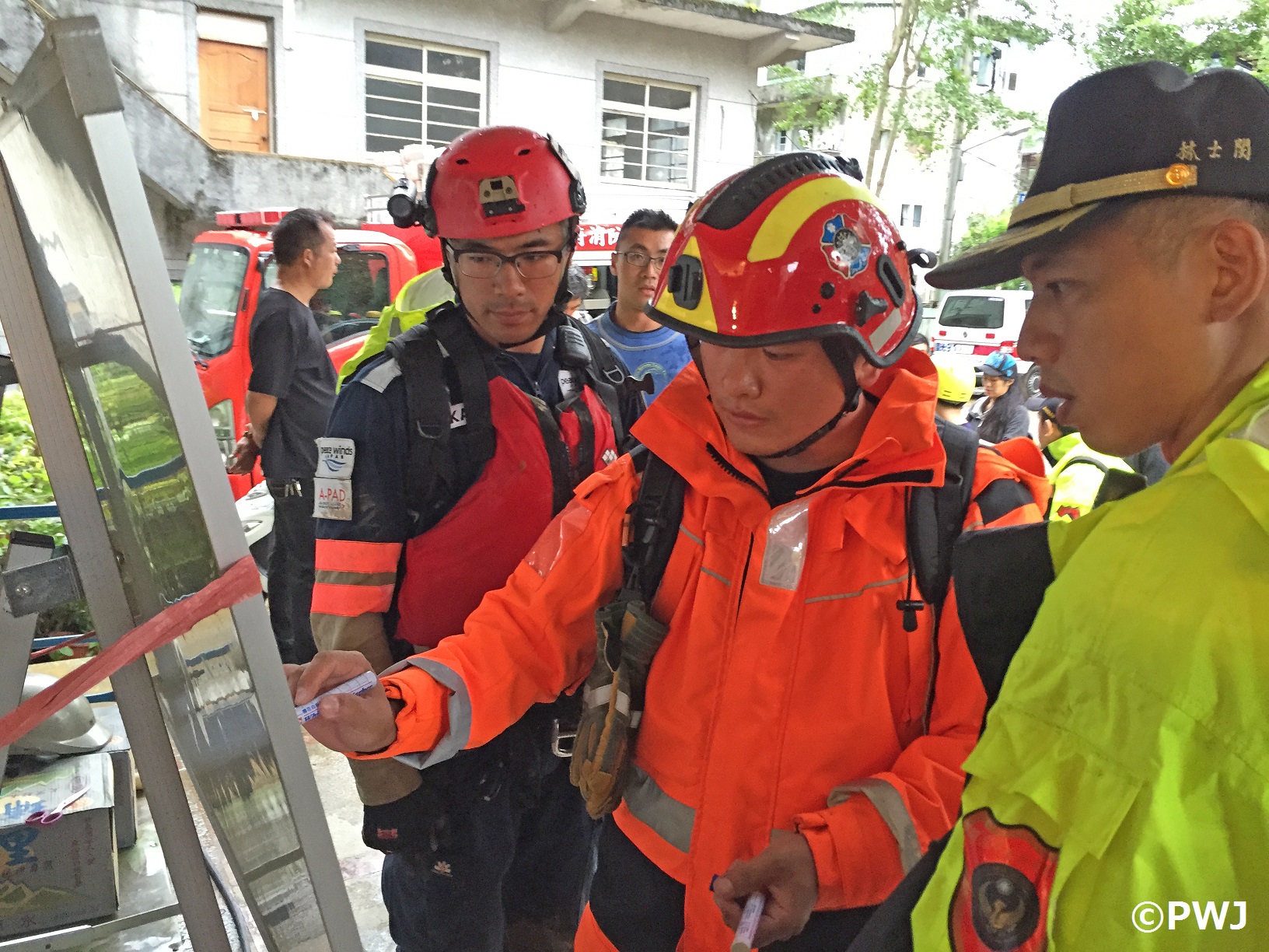 Although the search and rescue operation was called off, the team mobilized and prepared for operations on August 6, prior to the landing of the super Typhoon Soudelor. Throughout the operation, the team has been coordinating rescue operations with the Asia Pacific Alliance for Disaster Management, PWJ’s partner organization, as well as local police, fire station, and a local NGO Taiwan Root.